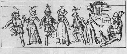 | 中世の放浪楽士 ヨーロッパ中世は9世紀から14世紀までのなだらかな時代変化によって形成されますが、それはカロリング朝から神聖ローマ帝国への封建国家の枠組み形成により展開します。この時代の文化を代表する芸術の動きとしては、ロマネスク芸術(グレゴリオ聖歌、トロバドゥール歌謡)からゴシック芸術(ノートルダム楽派、アルス・ノヴァ)を経て、ルネサンス芸術(ブルゴーニュ楽派)に移っていくものです。 この時代の音楽は作品としてただじっと鑑賞するためのものではなく、身分秩序のなかで演劇的なしぐさを伴う機会音楽として考えられ、人々が身分相応に喜怒哀楽を演じるための機会を提供する道具でした。楽器にもそれらの機会に応じた象徴的な意味での身分の序列があり、ラッパは公権力の象徴として塔のうえから時報を告げ、ハーディーガーディーやバグパイプは身分の低い人の楽器として疎んじられましたが庶民の踊りには不可欠でした。歌謡のスタイルも修道僧、騎士、放浪楽士と様々な身分と作法により分類されていたのです。ここでは庶民生活に関わる放浪楽士について述べるようにします。